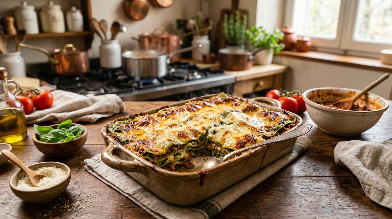 Il y a des recettes qui ne se font pas un mardi soir pressé. Les lasagnes vertes à la bolognaise font partie de ces plats qui exigent du temps, de l’attention et un dimanche entier devant soi. C’est ma recette réconfort par excellence, celle que je prépare quand je veux vraiment gâter ma tribu. Les pâtes fraîches aux épinards, la bolognaise qui mijote pendant des heures, la béchamel onctueuse…