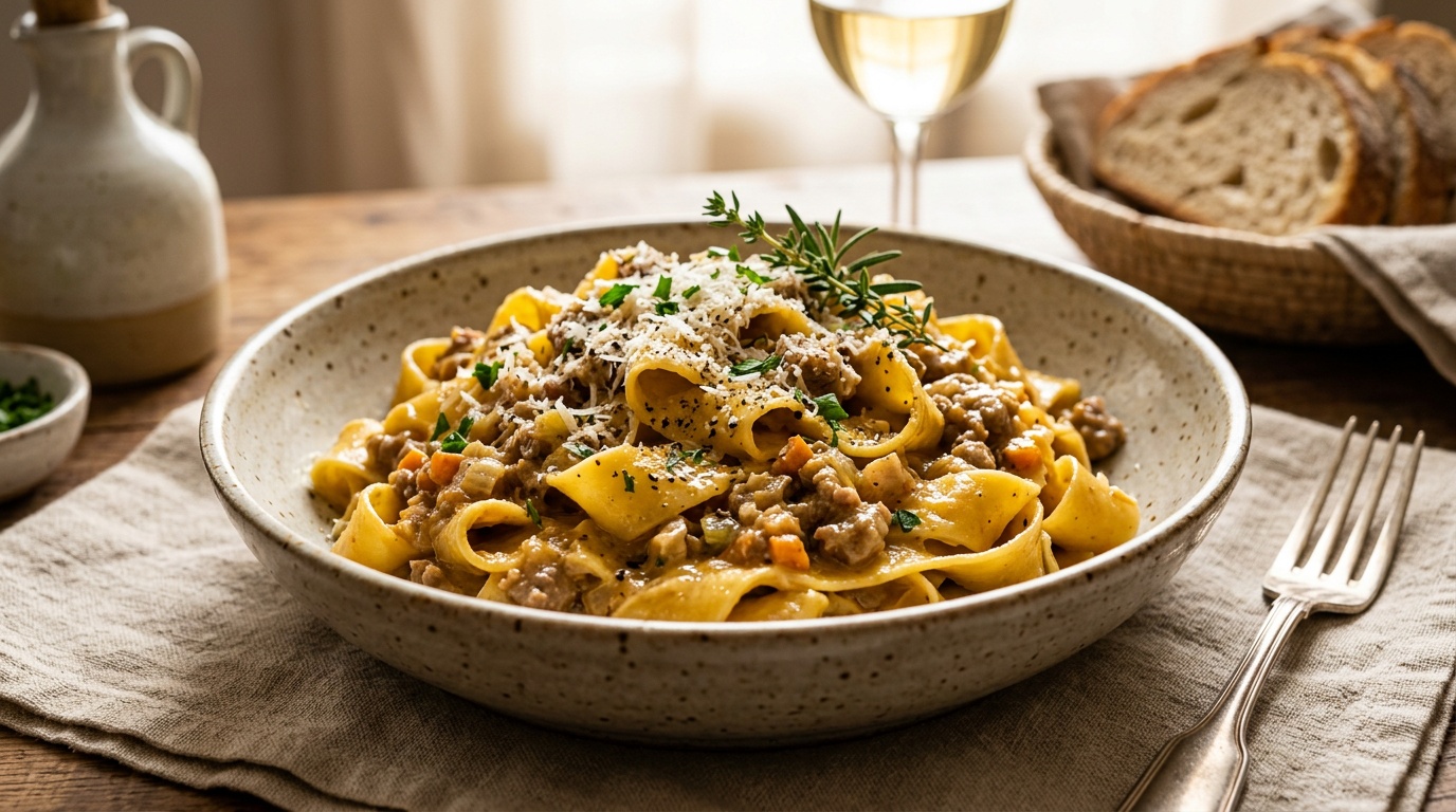 Lors de mon dernier séjour en Toscane, j'ai découvert ce trésor culinaire dans une trattoria familiale de Sienne : le ragù bianco. Contrairement à la bolognaise classique, cette sauce blanche au veau est la star des tables pascales toscanes. Sans tomate, elle révèle toute la délicatesse de la viande dans une onctuosité crémeuse sublimée par le vin blanc et les herbes fraîches. Les larges rubans de pappardelle captent parfaitement cette sauce généreuse. C'est devenu mon plat signature pour les grandes occasions, celui qui impressionne toujours mes invités gourmets. Une recette authentique qui demande du temps mais récompense par sa profondeur aromatique incomparable.